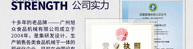 廣州旭眾食品機(jī)械有限公司是一家集科研開(kāi)發(fā),生產(chǎn)設(shè)計(jì),營(yíng)銷(xiāo)服務(wù)為一體的現(xiàn)代化生產(chǎn)企業(yè)?,F(xiàn)代化生產(chǎn)車(chē)間,精湛制造技術(shù),所產(chǎn)機(jī)械歷經(jīng)市場(chǎng)重重考驗(yàn),不斷贏得海內(nèi)外客戶的贊譽(yù)。