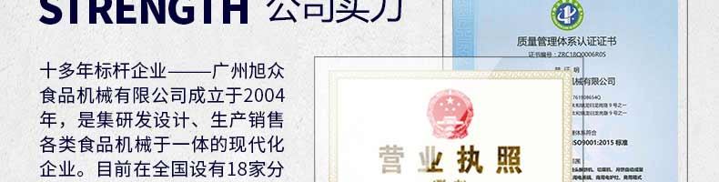 廣州旭眾食品機(jī)械有限公司是一家集科研開(kāi)發(fā),生產(chǎn)設(shè)計(jì),營(yíng)銷服務(wù)為一體的現(xiàn)代化生產(chǎn)企業(yè)?,F(xiàn)代化生產(chǎn)車間,精湛制造技術(shù),所產(chǎn)機(jī)械歷經(jīng)市場(chǎng)重重考驗(yàn),不斷贏得海內(nèi)外客戶的贊譽(yù)。