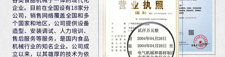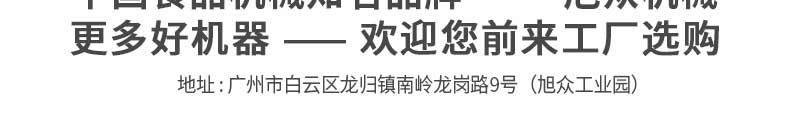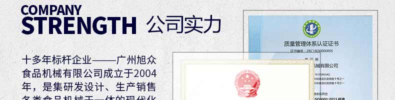 廣州旭眾食品機械有限公司是一家集科研開發(fā),生產設計,營銷服務為一體的現(xiàn)代化生產企業(yè)?,F(xiàn)代化生產車間,精湛制造技術,所產機械歷經市場重重考驗,不斷贏得海內外客戶的贊譽。