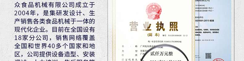 廣州旭眾食品機(jī)械有限公司是一家集科研開(kāi)發(fā),生產(chǎn)設(shè)計(jì),營(yíng)銷服務(wù)為一體的現(xiàn)代化生產(chǎn)企業(yè)?,F(xiàn)代化生產(chǎn)車間,精湛制造技術(shù),所產(chǎn)機(jī)械歷經(jīng)市場(chǎng)重重考驗(yàn),不斷贏得海內(nèi)外客戶的贊譽(yù)。