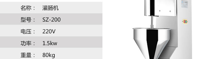 SZ-200灌腸機,適合灌制各種香腸、紅腸、臘腸及糊狀制品。本機使用敞開式不銹鋼料斗,適用于連續(xù)添加物料;與灌裝手接觸部件全部采用優(yōu)質不銹鋼制作以防生銹;該機自動貨程度高,技術先進、性能穩(wěn)定、操作簡便、工作效率高,具有不破壞物料成份,保質、保鮮等特點。