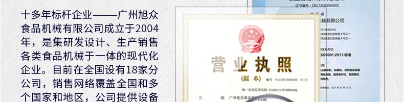 廣州旭眾食品機(jī)械有限公司是一家集科研開(kāi)發(fā),生產(chǎn)設(shè)計(jì),營(yíng)銷服務(wù)為一體的現(xiàn)代化生產(chǎn)企業(yè)?,F(xiàn)代化生產(chǎn)車間,精湛制造技術(shù),所產(chǎn)機(jī)械歷經(jīng)市場(chǎng)重重考驗(yàn),不斷贏得海內(nèi)外客戶的贊譽(yù)。