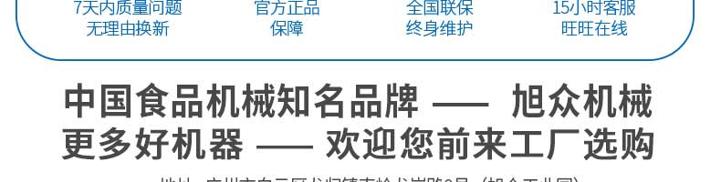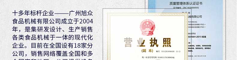 廣州旭眾食品機(jī)械有限公司是一家集科研開發(fā),生產(chǎn)設(shè)計,營銷服務(wù)為一體的現(xiàn)代化生產(chǎn)企業(yè)?,F(xiàn)代化生產(chǎn)車間,精湛制造技術(shù),所產(chǎn)機(jī)械歷經(jīng)市場重重考驗,不斷贏得海內(nèi)外客戶的贊譽(yù)。