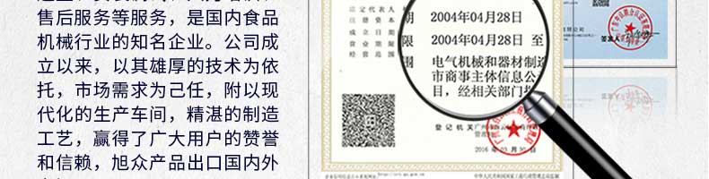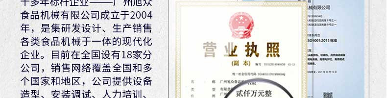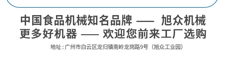 廣州旭眾食品機(jī)械有限公司是一家集科研開(kāi)發(fā),生產(chǎn)設(shè)計(jì),營(yíng)銷(xiāo)服務(wù)為一體的現(xiàn)代化生產(chǎn)企業(yè)?,F(xiàn)代化生產(chǎn)車(chē)間,精湛制造技術(shù),所產(chǎn)機(jī)械歷經(jīng)市場(chǎng)重重考驗(yàn),不斷贏得海內(nèi)外客戶(hù)的贊譽(yù)。