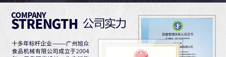 廣州旭眾食品機(jī)械有限公司是一家集科研開(kāi)發(fā),生產(chǎn)設(shè)計(jì),營(yíng)銷服務(wù)為一體的現(xiàn)代化生產(chǎn)企業(yè)?,F(xiàn)代化生產(chǎn)車間,精湛制造技術(shù),所產(chǎn)機(jī)械歷經(jīng)市場(chǎng)重重考驗(yàn),不斷贏得海內(nèi)外客戶的贊譽(yù)。