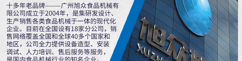 廣州旭眾食品機械有限公司是一家集科研開發(fā),生產(chǎn)設(shè)計,營銷服務(wù)為一體的現(xiàn)代化生產(chǎn)企業(yè)?,F(xiàn)代化生產(chǎn)車間,精湛制造技術(shù),所產(chǎn)機械歷經(jīng)市場重重考驗,不斷贏得海內(nèi)外客戶的贊譽。