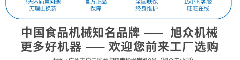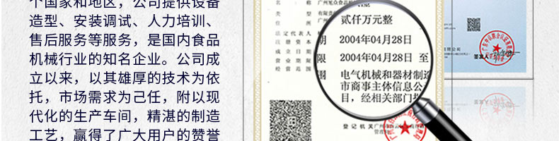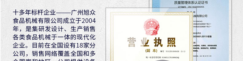 廣州旭眾食品機械有限公司是一家集科研開發(fā),生產(chǎn)設(shè)計,營銷服務(wù)為一體的現(xiàn)代化生產(chǎn)企業(yè)?,F(xiàn)代化生產(chǎn)車間,精湛制造技術(shù),所產(chǎn)機械歷經(jīng)市場重重考驗,不斷贏得海內(nèi)外客戶的贊譽。