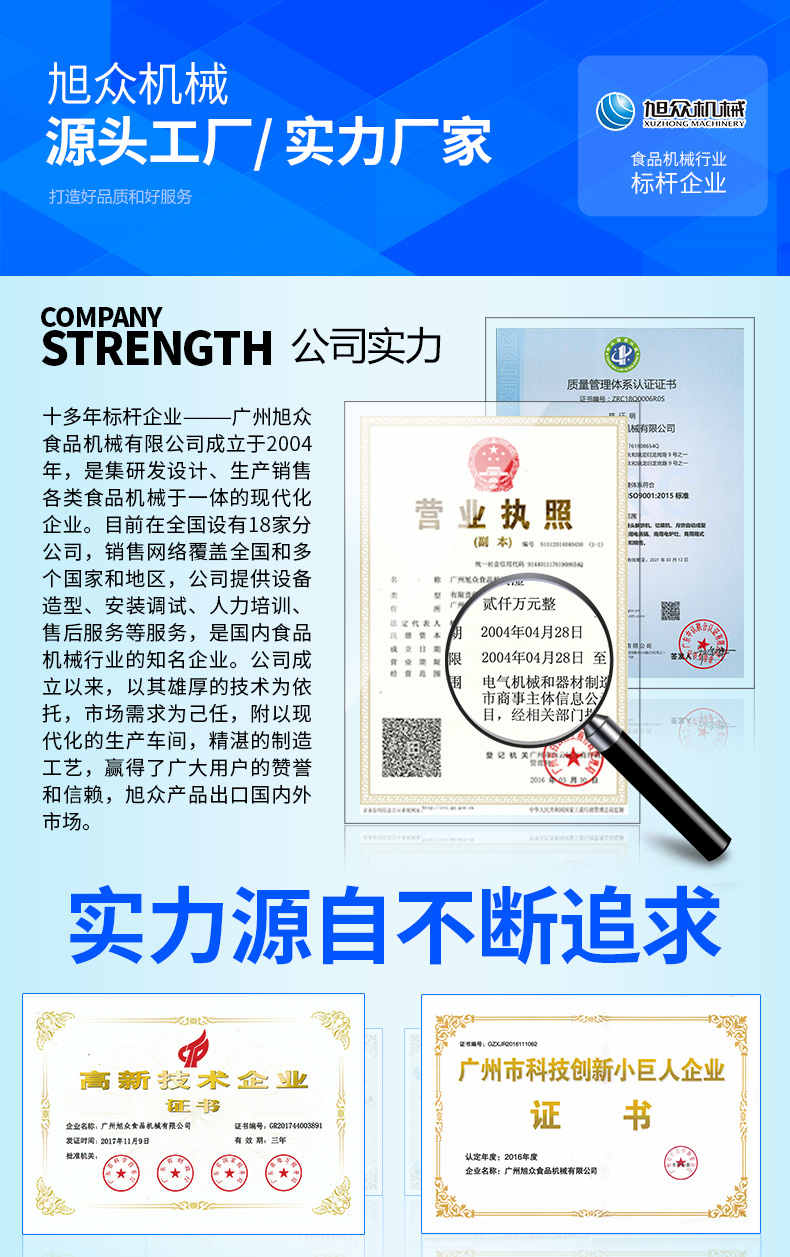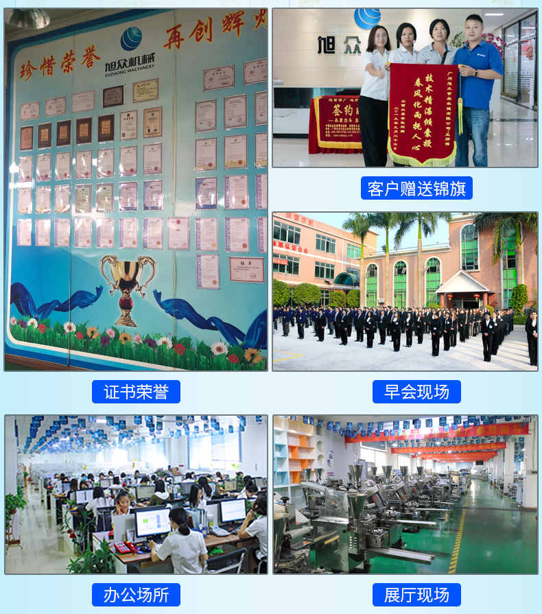 廣州旭眾食品機(jī)械有限公司是一家集科研開發(fā),生產(chǎn)設(shè)計,營銷服務(wù)為一體的現(xiàn)代化生產(chǎn)企業(yè)?,F(xiàn)代化生產(chǎn)車間,精湛制造技術(shù),所產(chǎn)機(jī)械歷經(jīng)市場重重考驗,不斷贏得海內(nèi)外客戶的贊譽。