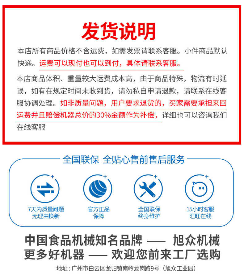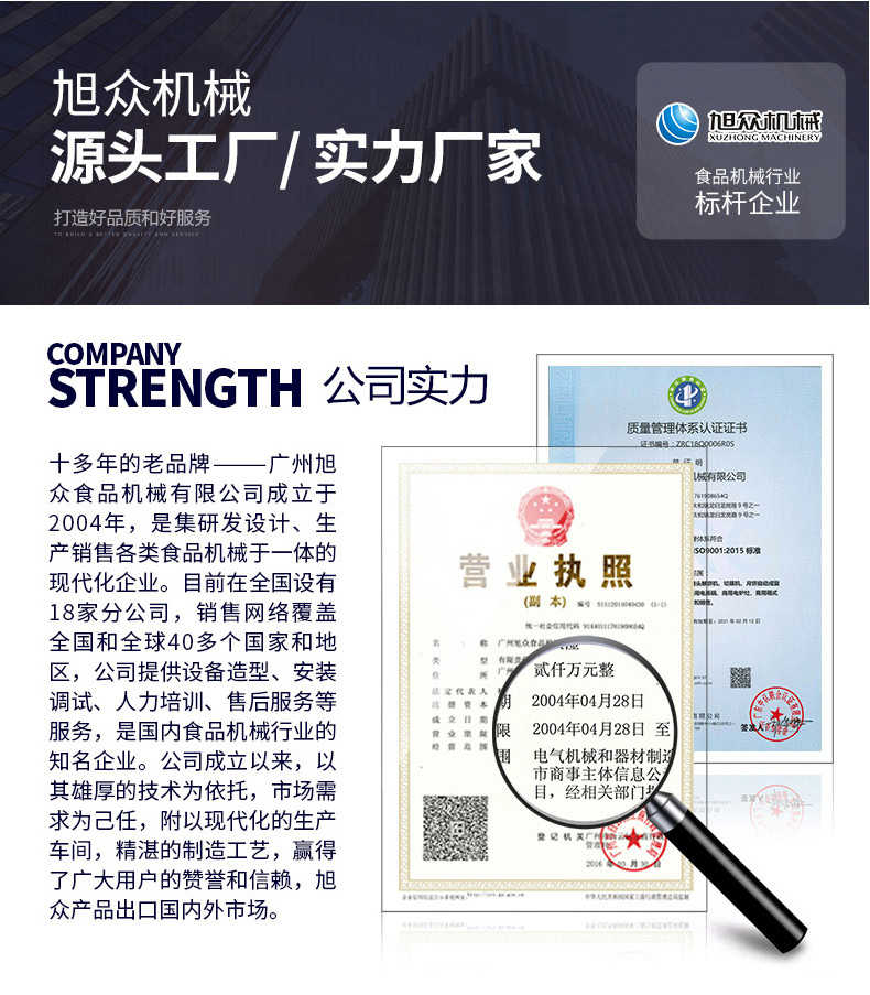 廣州旭眾食品機械有限公司是一家集科研開發(fā),生產(chǎn)設計,營銷服務為一體的現(xiàn)代化生產(chǎn)企業(yè)。現(xiàn)代化生產(chǎn)車間,精湛制造技術,所產(chǎn)機械歷經(jīng)市場重重考驗,不斷贏得海內外客戶的贊譽。