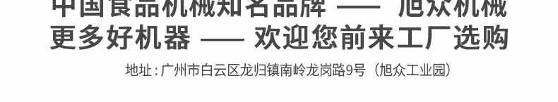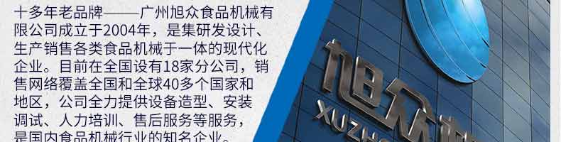 廣州旭眾食品機械有限公司是一家集科研開發(fā),生產(chǎn)設(shè)計,營銷服務(wù)為一體的現(xiàn)代化生產(chǎn)企業(yè)。現(xiàn)代化生產(chǎn)車間,精湛制造技術(shù),所產(chǎn)機械歷經(jīng)市場重重考驗,不斷贏得海內(nèi)外客戶的贊譽。