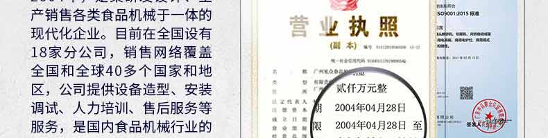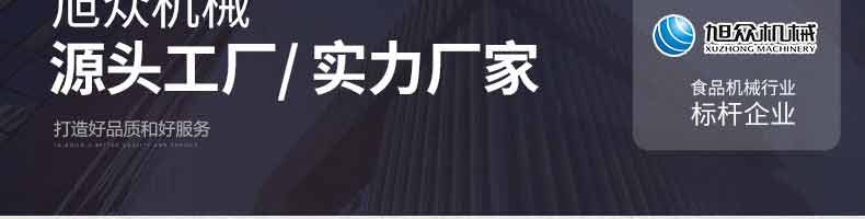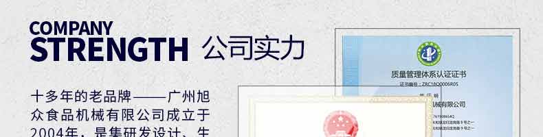 廣州旭眾食品機(jī)械有限公司是一家集科研開發(fā),生產(chǎn)設(shè)計(jì),營銷服務(wù)為一體的現(xiàn)代化生產(chǎn)企業(yè)。現(xiàn)代化生產(chǎn)車間,精湛制造技術(shù),所產(chǎn)機(jī)械歷經(jīng)市場重重考驗(yàn),不斷贏得海內(nèi)外客戶的贊譽(yù)。