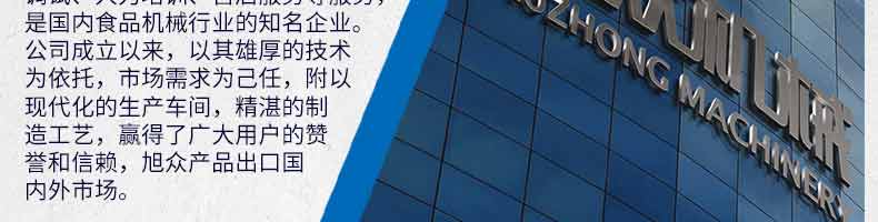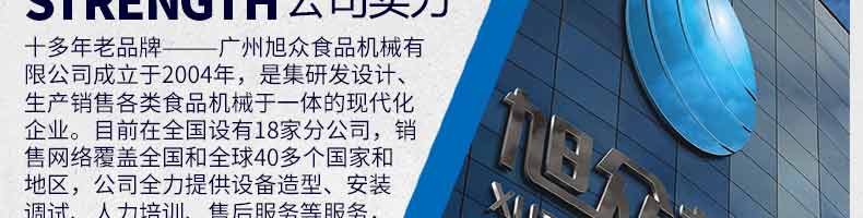 廣州旭眾食品機(jī)械有限公司是一家集科研開(kāi)發(fā),生產(chǎn)設(shè)計(jì),營(yíng)銷服務(wù)為一體的現(xiàn)代化生產(chǎn)企業(yè)。現(xiàn)代化生產(chǎn)車間,精湛制造技術(shù),所產(chǎn)機(jī)械歷經(jīng)市場(chǎng)重重考驗(yàn),不斷贏得海內(nèi)外客戶的贊譽(yù)。