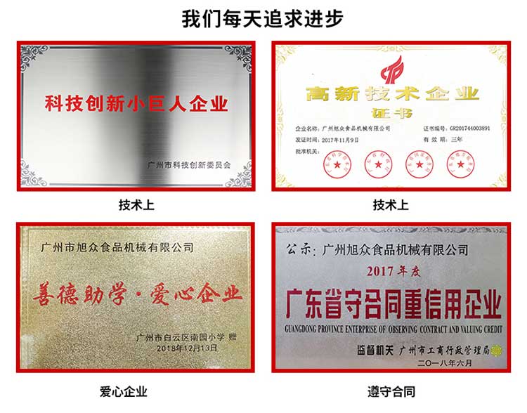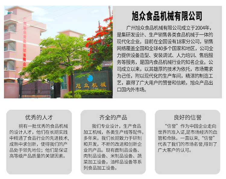 廣州旭眾食品機械有限公司是一家集科研開發(fā),生產(chǎn)設計,營銷服務為一體的現(xiàn)代化生產(chǎn)企業(yè)?,F(xiàn)代化生產(chǎn)車間,精湛制造技術(shù),所產(chǎn)機械歷經(jīng)市場重重考驗,不斷贏得海內(nèi)外客戶的贊譽。