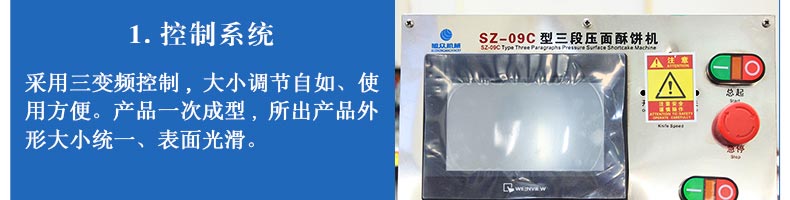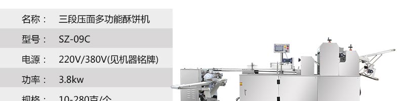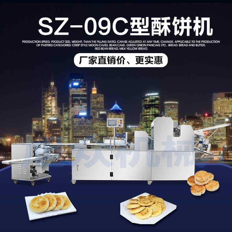 SZ-09C三段壓面蘇式月餅機,生產速度、制品大小、重量、皮餡比例可隨時調整、變更。適用于蘇式月餅、綠豆餅、老婆餅、蔥油餅、鮮花餅、肉松餅、金華酥餅等。適用于大、中型糕餅生產廠家,免費提供工藝技術。