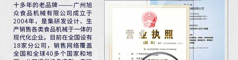廣州旭眾食品機械有限公司是一家集科研開發(fā),生產(chǎn)設(shè)計,營銷服務(wù)為一體的現(xiàn)代化生產(chǎn)企業(yè)?,F(xiàn)代化生產(chǎn)車間,精湛制造技術(shù),所產(chǎn)機械歷經(jīng)市場重重考驗,不斷贏得海內(nèi)外客戶的贊譽。