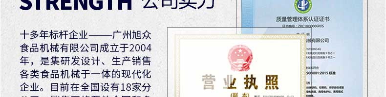 廣州旭眾食品機械有限公司是一家集科研開發(fā),生產設計,營銷服務為一體的現代化生產企業(yè)?,F代化生產車間,精湛制造技術,所產機械歷經市場重重考驗,不斷贏得海內外客戶的贊譽。