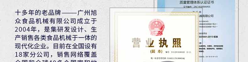 廣州旭眾食品機(jī)械有限公司是一家集科研開發(fā),生產(chǎn)設(shè)計(jì),營(yíng)銷服務(wù)為一體的現(xiàn)代化生產(chǎn)企業(yè)?,F(xiàn)代化生產(chǎn)車間,精湛制造技術(shù),所產(chǎn)機(jī)械歷經(jīng)市場(chǎng)重重考驗(yàn),不斷贏得海內(nèi)外客戶的贊譽(yù)。